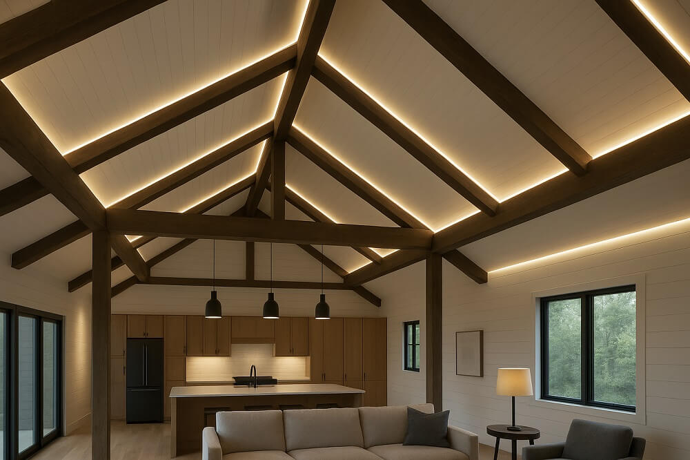 Barndominium Recessed “Slot” Lighting: Creating Lines of Light Along Beams and Ceiling Junctures